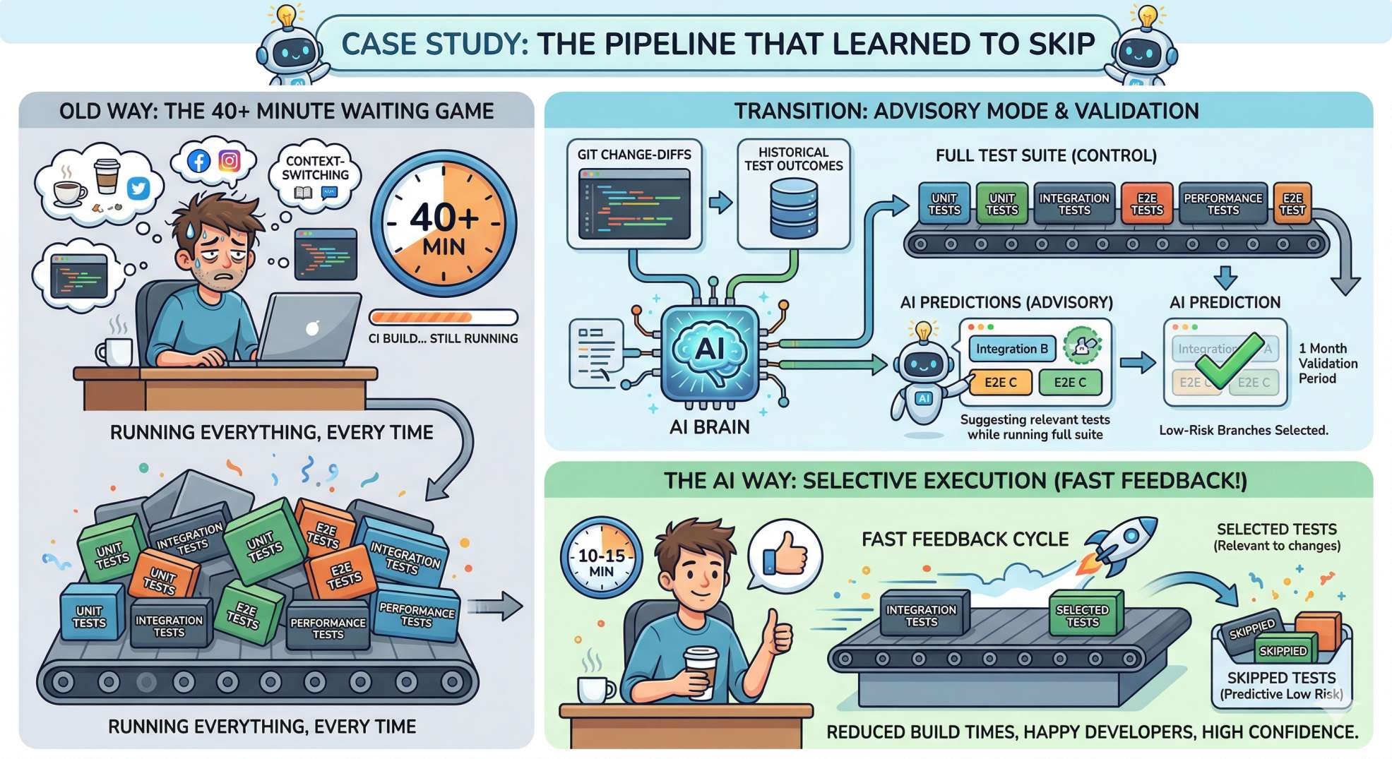 Imagine a mid-size product company plagued by long build times. Developers waited 40+ minutes for CI feedback, leading to context-switching and frustration. The team trained a model to predict which tests fail based on change-diffs and historical test outcomes. They started by running the model in advisory mode: suggesting tests to run while still executing full suites. After a month of validation, they enabled selective execution for low-risk branches.