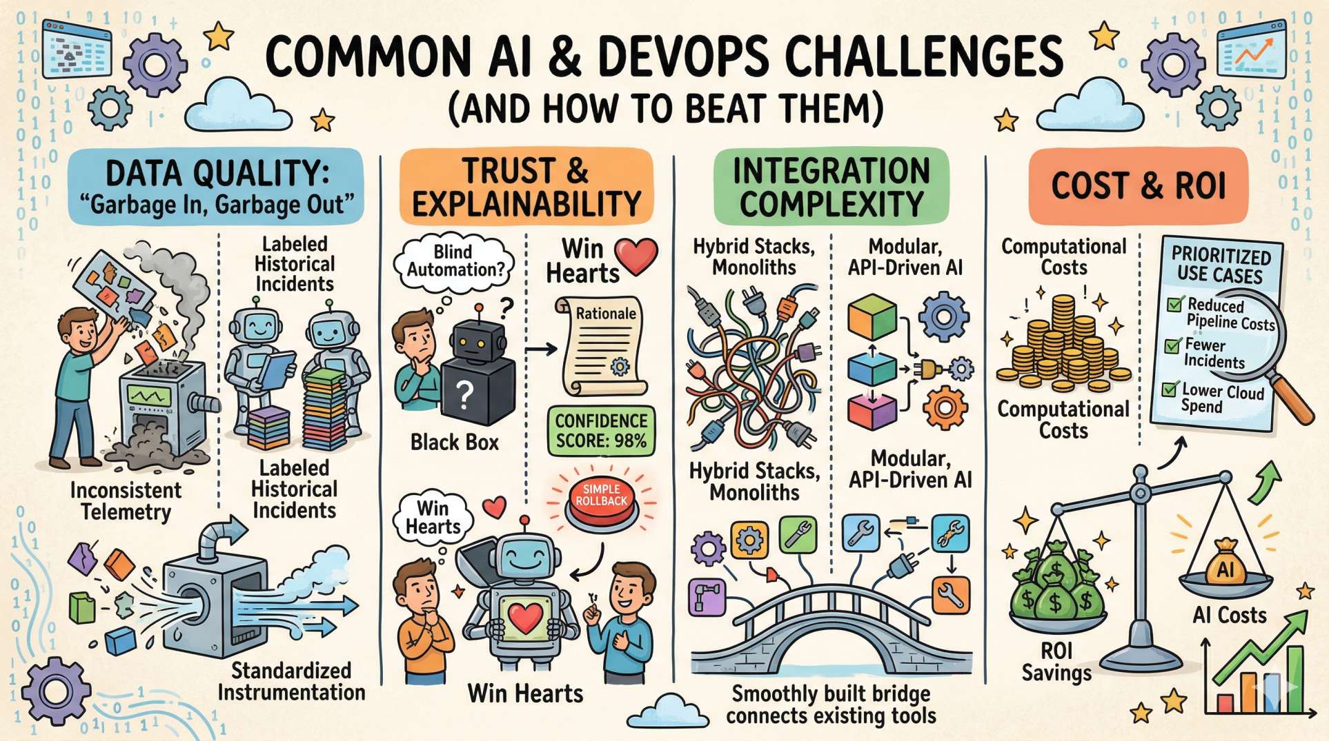 Engineers resist blind automation. Provide rationale for predictions, confidence scores, and simple rollback paths to build confidence. A transparent system wins hearts (and on-call shifts). ❤