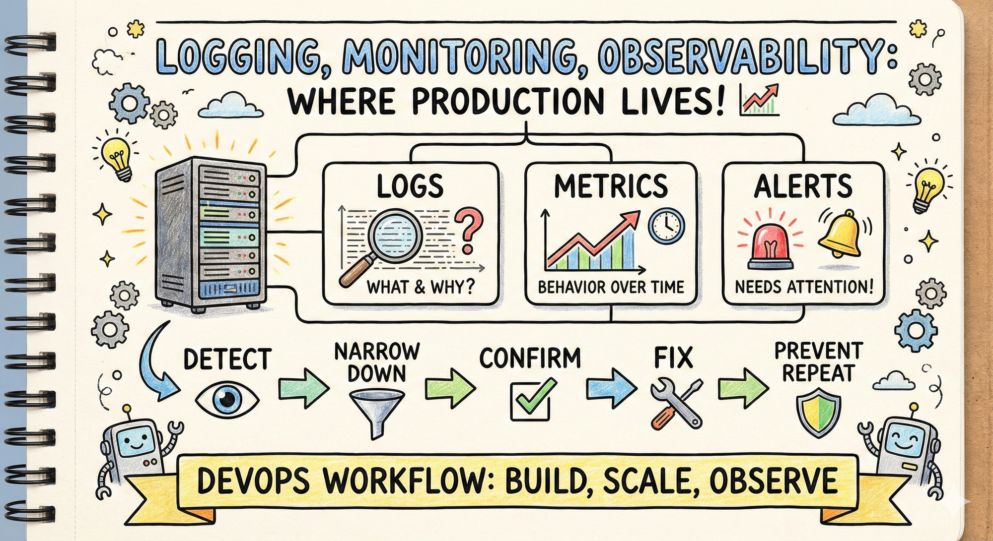 5) Logging, monitoring, observability (this is where production lives) 📈