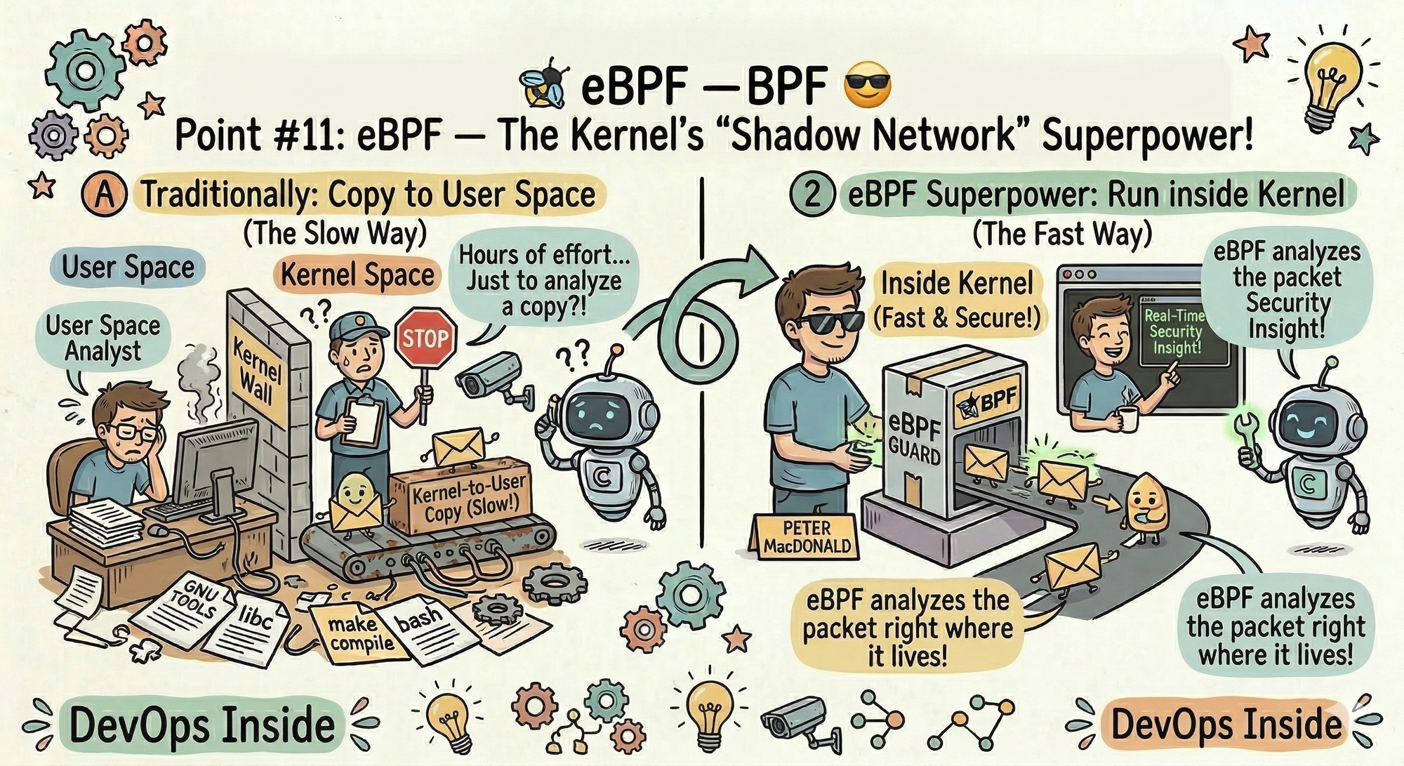 - The Senior Dev Insight: Traditionally, to monitor a network packet, you had to copy it from "Kernel Space" to "User Space" (which is slow). With eBPF, you can analyze the packet right where it lives. It’s the difference between checking a security camera later and having a guard standing right behind the door.