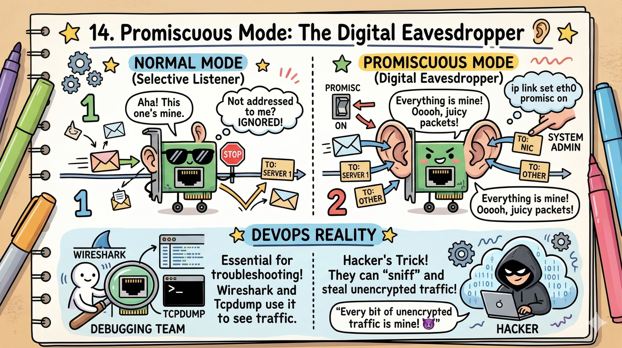 ip link set eth0 promisc on), the interface catches every packet passing through the wire, even if it's meant for someone else. - DevOps Reality: This is how tools like Wireshark or Tcpdump work. It’s essential for debugging, but if a hacker turns this on in your cluster, they can "sniff" every bit of unencrypted traffic.