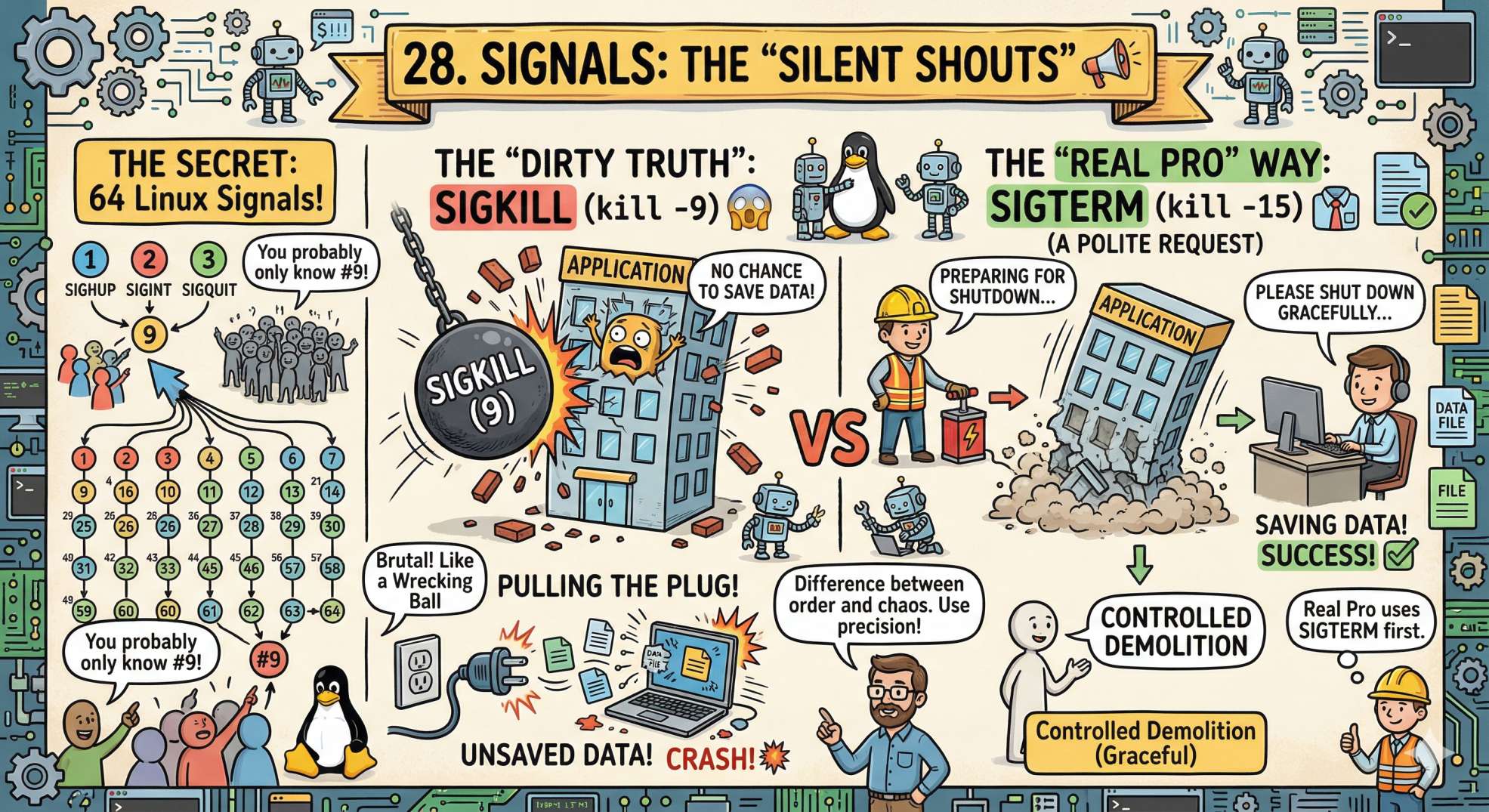 SIGKILL(kill -9) is like pulling the plug on a computer—it doesn't give the app a chance to save data. A real pro usesSIGTERM(15) first, which is a "polite" request to shut down gracefully. It’s the difference between a controlled demolition and a wrecking ball.