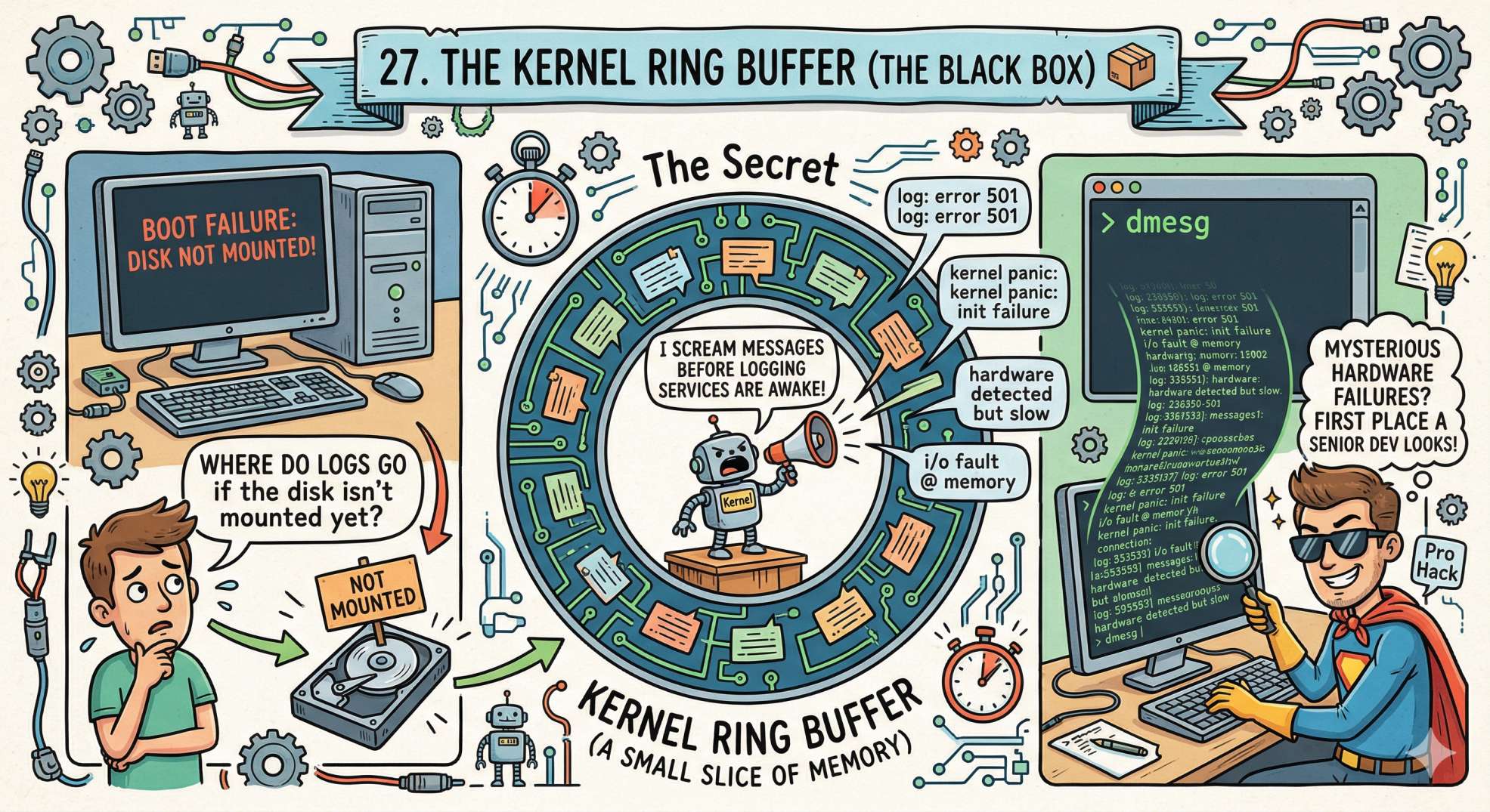 - The Secret: They go to the Kernel Ring Buffer, a small slice of memory that the kernel uses to scream its messages before the logging services are even awake.